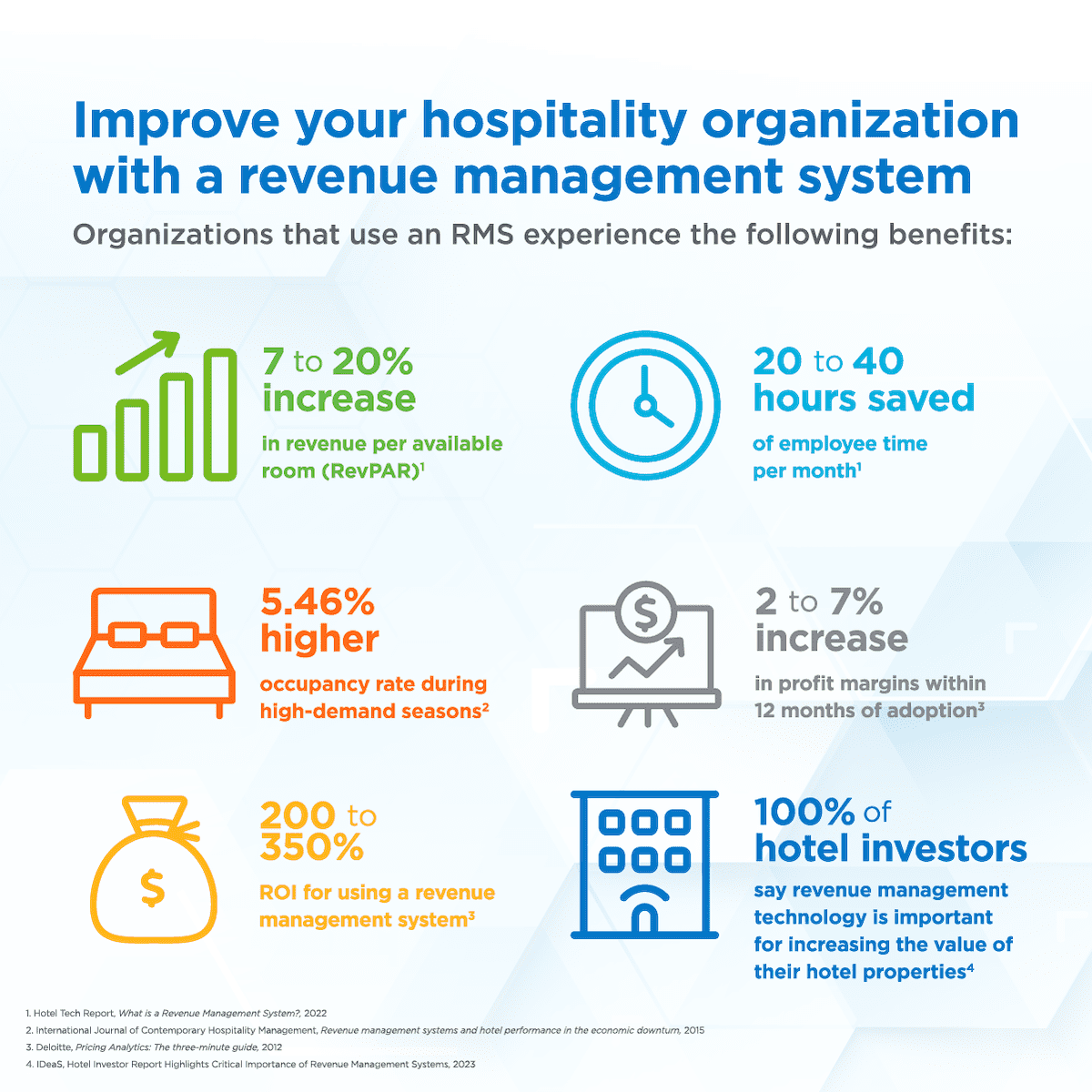 - 83 percent of hotel investors describe the ROI of revenue management technology as “high” or “very high.” (IDeaS and Benchmark Research Partners survey of hotel investors)